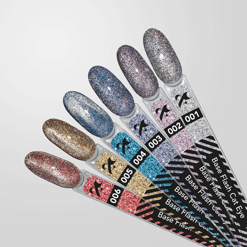 У Flash Cover Base це виразне мерехтіння з ксеноновим ефектом, що проявляється на повну силу, варто лише прямим променям впасти на ніготь. Потужність відблиску можна порівняти зі снігом, що іскриться під небом зимового сонячного полудня. І водночас покриття виглядає неймовірно ніжним. Для порівняння у базах F.O.X Shot Base Cat Eye світловідбиваючі піщинки більш концентровані та доповнені магнітним ефектом.