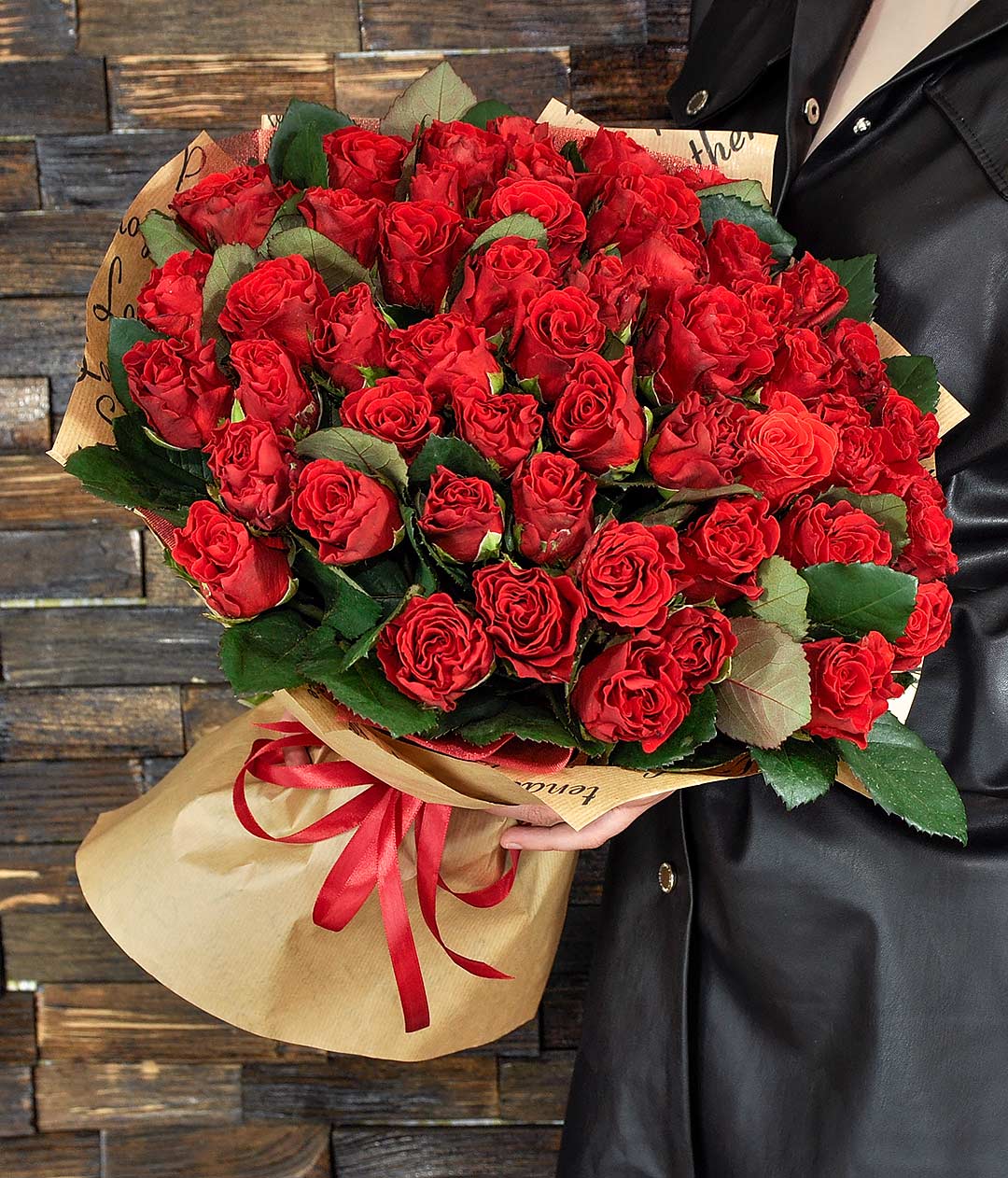 У каталозі представлені звичайні, піоноподібні та кущові троянди у всіляких відтінках. Вони зібрані в композиції з різною кількістю одиниць – від 9 до 301. Ви можете вибрати монобукет із троянд або композицію, де вони поєднуються з іншими рослинами.